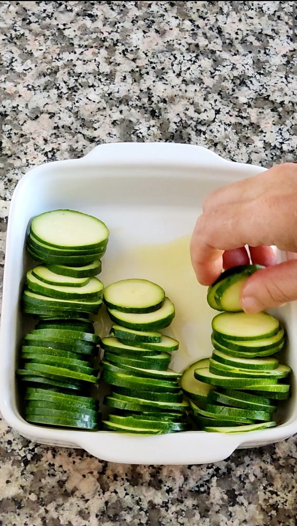 Unte uma pequena assadeira quadrada com óleo, de tamanho suficiente para acomodar então as fatias de abobrinha uma ao lado da outra. Organize as fatias formando listras e preenchendo depois os espaços vazios.