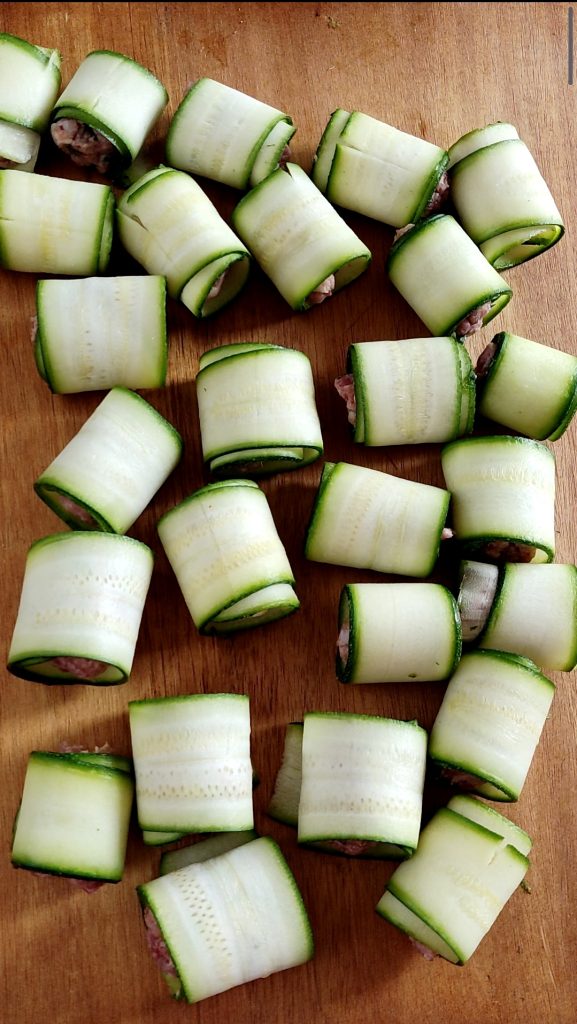 Misture primeiro com um garfo e depois com as mãos. Estenda as fatias de abobrinha sobre a superfície de trabalho. Pegue uma bolinha do recheio como se fosse uma pequena almôndega e coloque sobre uma fatia de abobrinha.