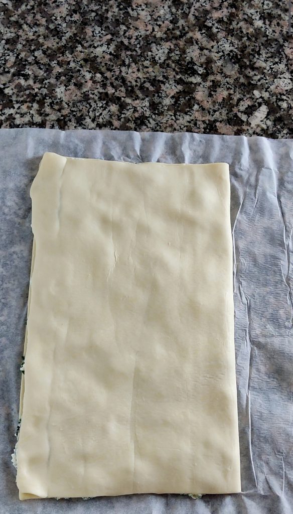 Estenda o rolo de massa folhada sobre a superfície de trabalho e divida-o em 2 partes. Espalhe a mistura de ricota e espinafre sobre uma metade da massa folhada.