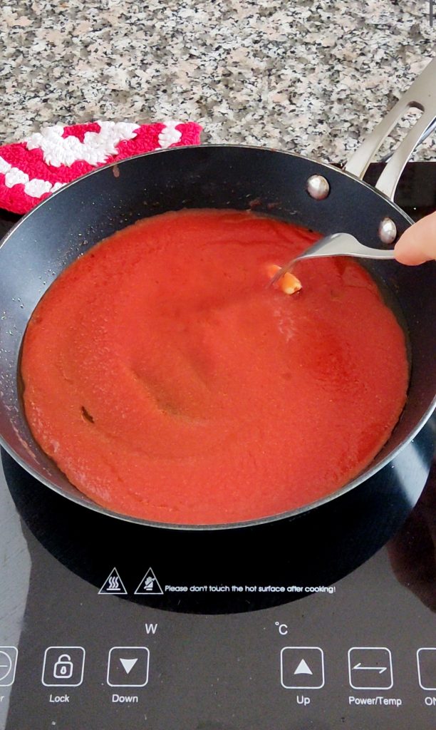 Deixe fritar levemente e adicione o passata de tomate. Ajuste o sal e deixe cozinhar em fogo baixo por 6-7 minutos, cobrindo a frigideira com uma tampa. Retire o dente de alho.