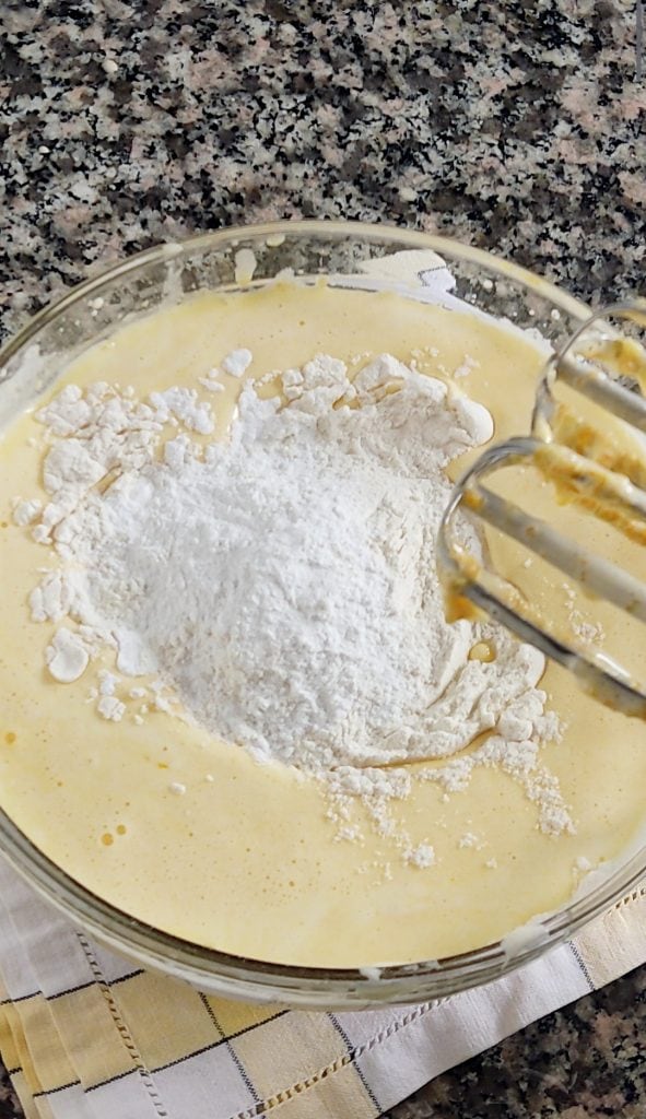 Adicione a farinha peneirada e o fermento em pó e misture.