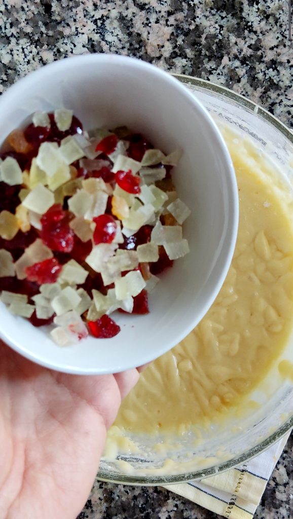 Escorra as passas e adicione à massa junto com as frutas cristalizadas em pequenos cubos. Misture com uma espátula para incorporá-los à massa.
