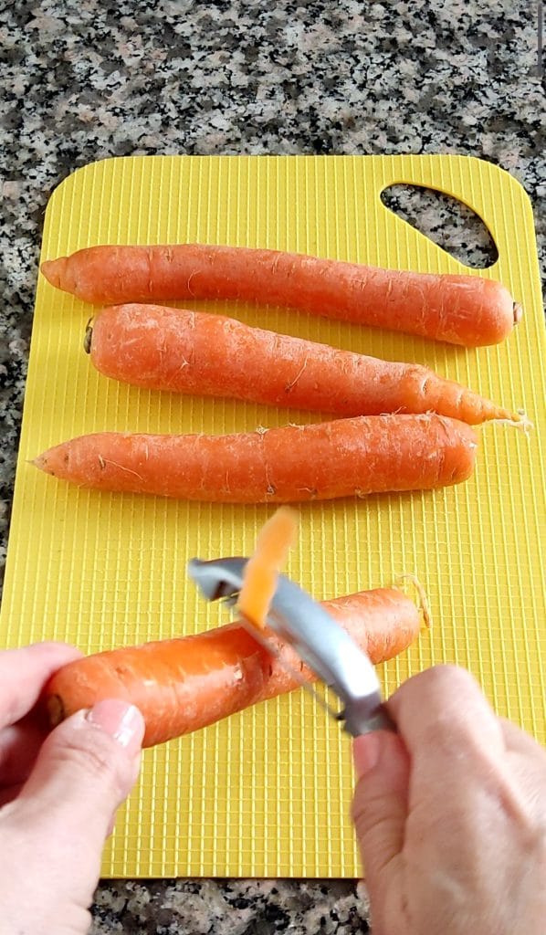 Descasque as cenouras. Corte-as em pedaços. Coloque as cenouras em um mixer e adicione o óleo de sementes.