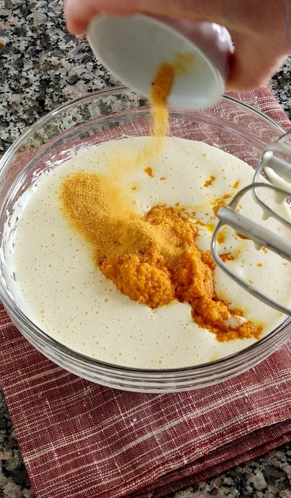 Bata os 2 ovos com o açúcar com a ajuda de uma batedeira elétrica. Adicione o creme de cenouras e a casca ralada de meia laranja não tratada. Misture.