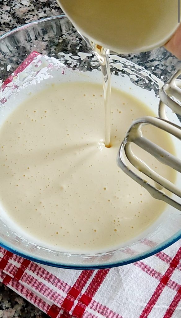Bata os 2 ovos inteiros com o açúcar usando uma batedeira elétrica por 6-7 minutos até obter uma mistura clara e espumosa.