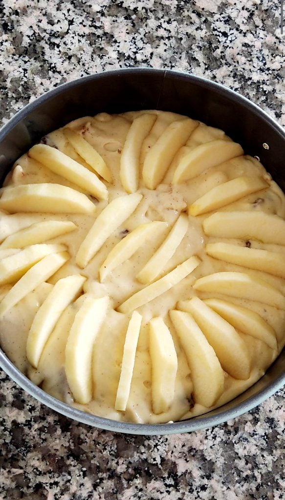 Despeje a massa em uma forma de 20 cm de diâmetro, de preferência com fundo removível, untada ou forrada com papel manteiga. Arrume as fatias de maçã na superfície, deixando-as afundar ligeiramente na massa. Distribua também as uvas passas restantes na superfície.