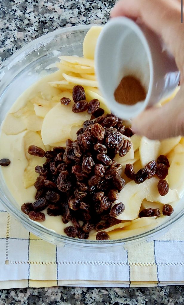 Adicione metade das fatias de maçã, as uvas passas escorridas e a canela. Misture com uma espátula para incorporá-las à massa.