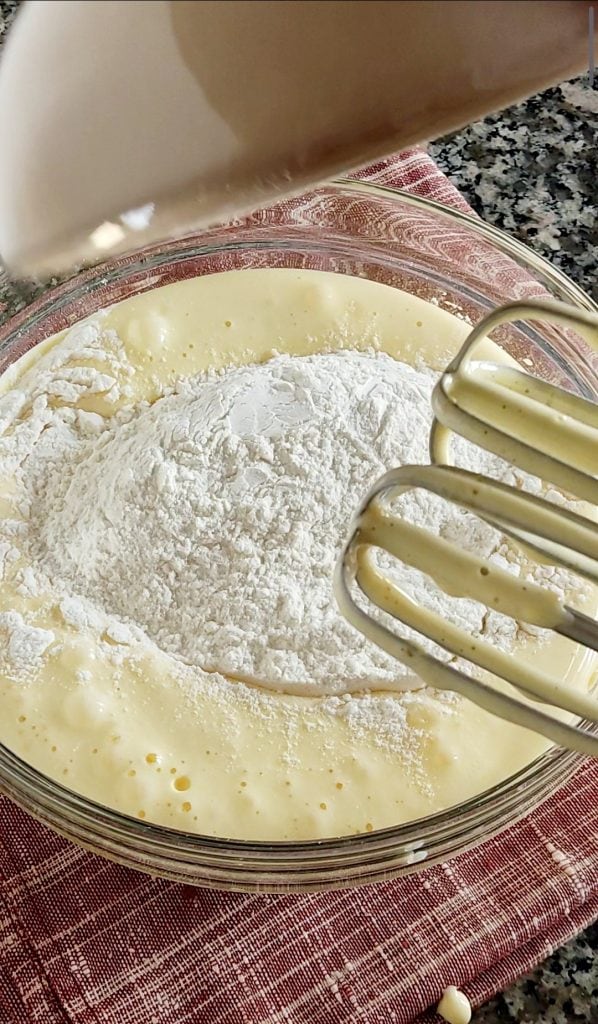 Continue a preparação adicionando a farinha peneirada e o fermento em pó. Misture