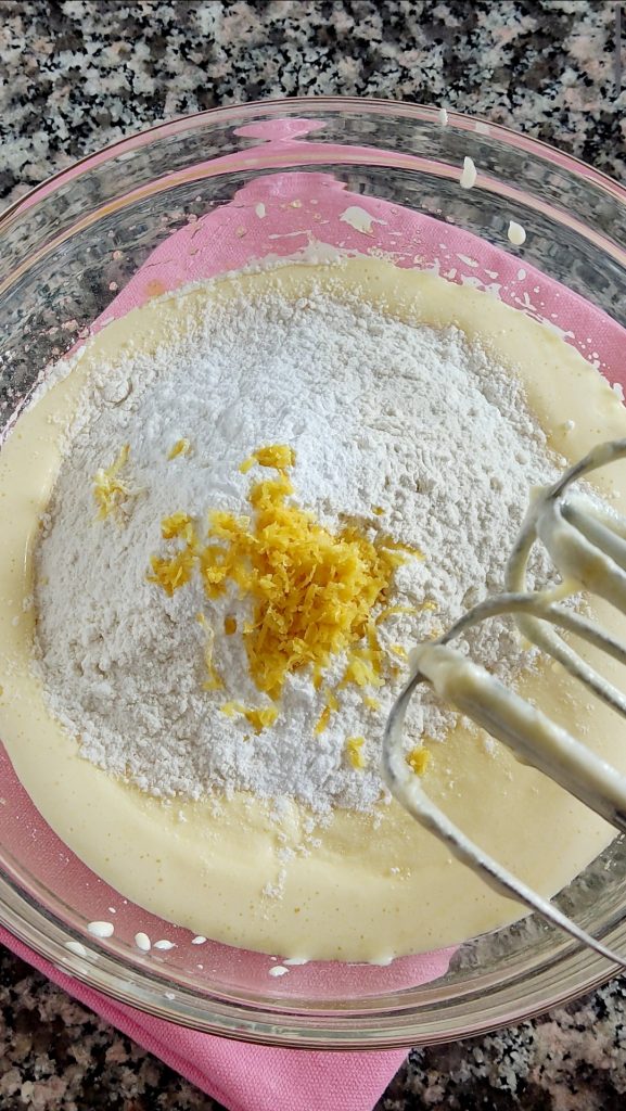 Continue o preparo do bolo adicionando a farinha peneirada, o fermento em pó para bolos e a raspa ralada de um limão não tratado. Misture bem. Despeje a massa em uma assadeira retangular untada e enfarinhada ou forrada com papel manteiga.