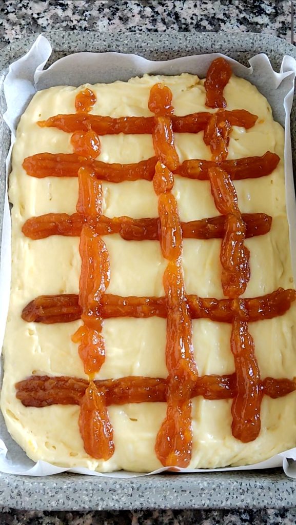 Minha assadeira mede 21 x 28 cm. Nivele a massa com uma espátula. Transfira a geleia de damasco para um saco de confeitar com bico largo em formato de estrela. Pré-aqueça o forno a 180°. Distribua a geleia sobre a massa do bolo fazendo tiras horizontais e verticais formando uma espécie de grade.