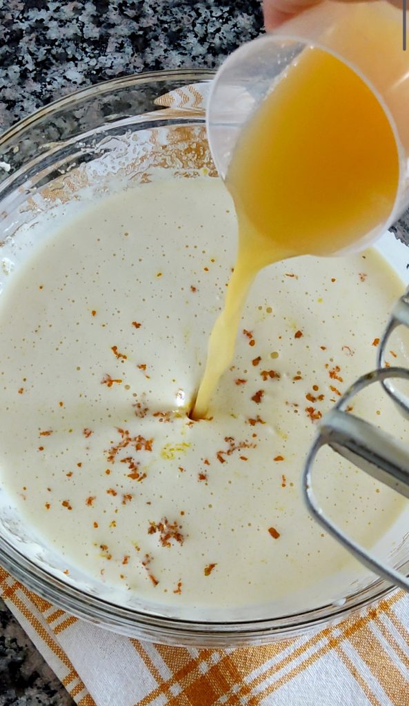 Adicione às claras batidas a casca da laranja, o suco e o óleo de sementes. Misture