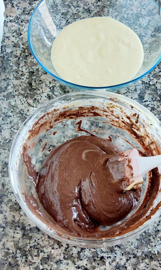Despeje as 2 massas alternando-as entre si. Despeje 4-5 colheres de sopa de massa clara no fundo, depois 4-5 colheres de sopa de massa de cacau e continue desta forma até terminar as duas massas.