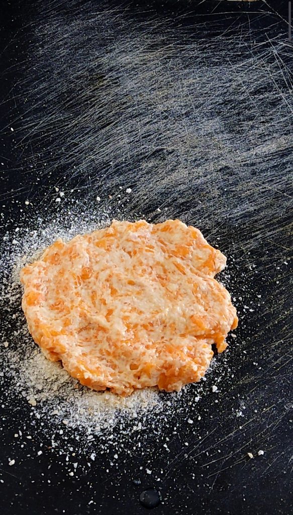 Aperte com as mãos e, com a ajuda de uma forminha redonda ou simplesmente um copo, corte a cotoleta.