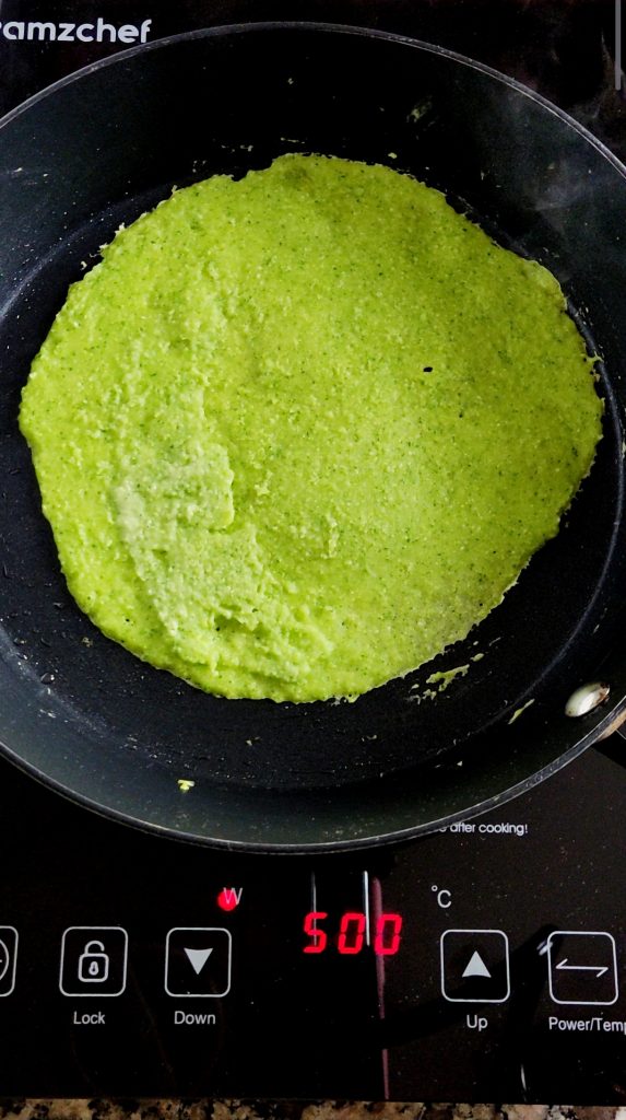 Adicione um ovo, o sal e, aos poucos, a farinha, mexendo com um batedor para evitar grumos. Misture até obter uma massa densa. Unte uma frigideira de 24 cm de diâmetro e deixe aquecer. Despeje uma concha de massa na frigideira, espalhando por toda a superfície. Deixe cozinhar em fogo médio por cerca de 2-3 minutos.