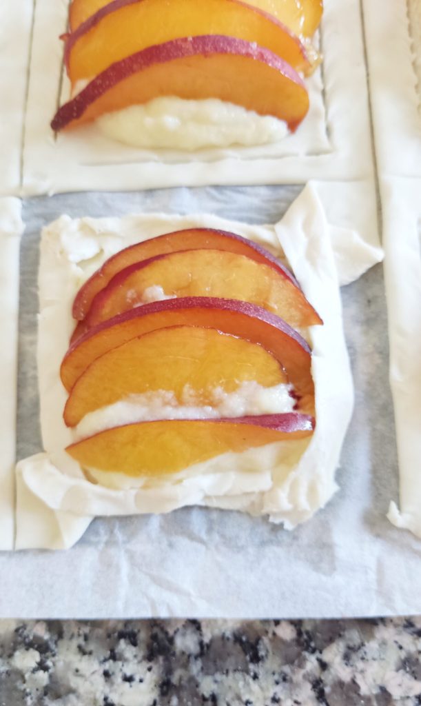 Coloque 2-3 colheres de sopa de creme no centro de cada quadrado de massa folhada. Coloque 5-6 fatias de pêssego por cima. Levante uma aba e sobreponha-a no lado oposto e faça o mesmo com o lado oposto da moldura de massa folhada. Pressione ao redor com as mãos