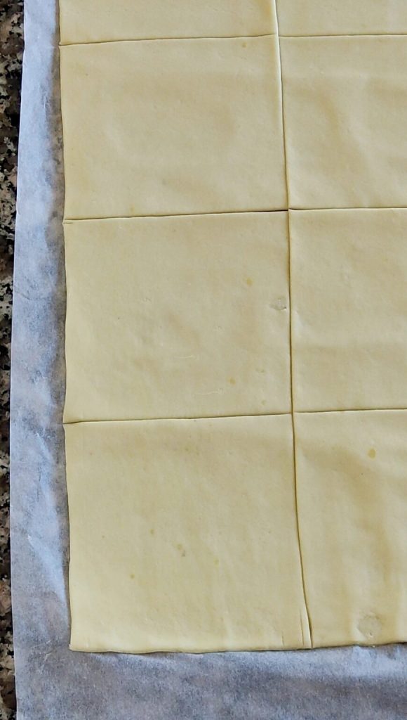 Abra um rolo de massa folhada retangular sobre a superfície de trabalho e divida-o em vários quadrados, eu consegui 12. Com uma faca, faça uma moldura em cada quadrado de massa folhada, deixando intactos 2 cantos opostos. Vai ser fácil observando as fotos