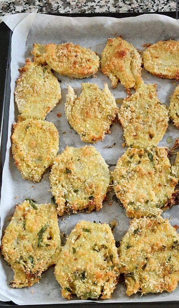 Funcho empanado no forno gostoso e saboroso. Mas que delícia é o funcho, tão versátil que se presta à preparação de muitas receitas e também cru é delicioso, mesmo que infelizmente cru eu não consigo digeri-los e então tenho que preparar muitas receitas. O funcho além de ser tão gostoso é pobre em calorias, então perfeito também para quem está de dieta, são digestivos e depurativos, além disso, são super econômicos, o que é ótimo! A receita que quero contar hoje é de deliciosos Filés de funcho no forno, crocantes por fora e macios por dentro. Para prepará-los, você gastará muito pouco tempo e nem precisa cozinhar antes o funcho, apenas empaná-los e assá-los no forno. Recomendo não perder também a receita da Torta de funcho e a receita dos Funcho à pizzaiola. Em casa foram apreciadíssimos e desapareceram num instante, por isso só posso recomendar que os preparem logo e não esqueçam de me contar se gostaram. Vamos então para a cozinha e preparar juntos os Funcho no forno