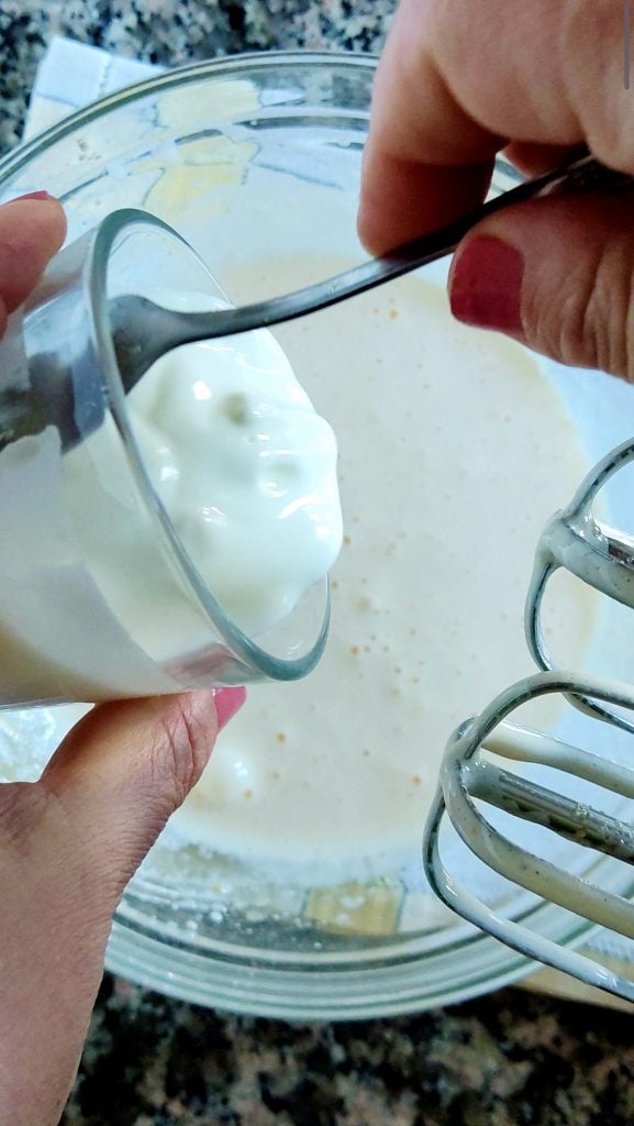 Adicione a manteiga derretida e um pote de iogurte natural. Misture. Continue a preparação adicionando a farinha peneirada, o fermento em pó e as raspas de meio limão não tratado. Misture.