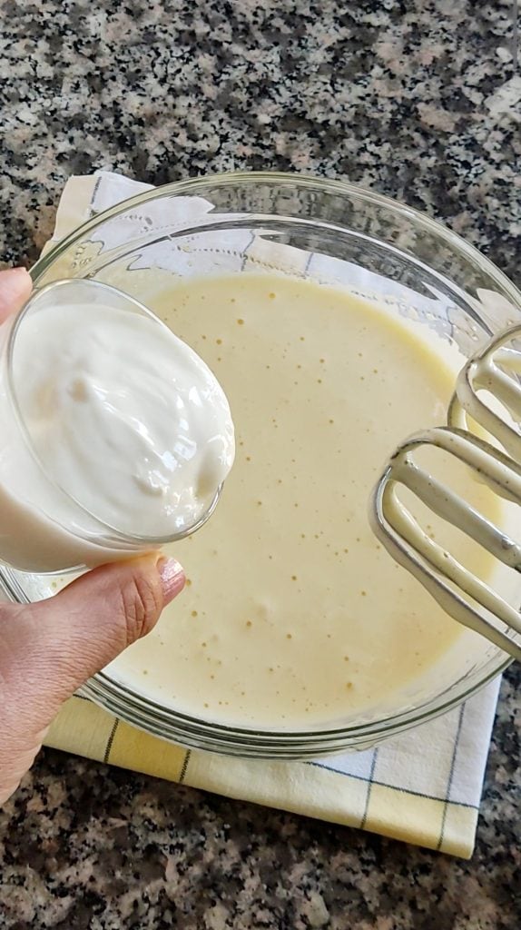 Adicione um pote de iogurte natural e o óleo de sementes. Misture.