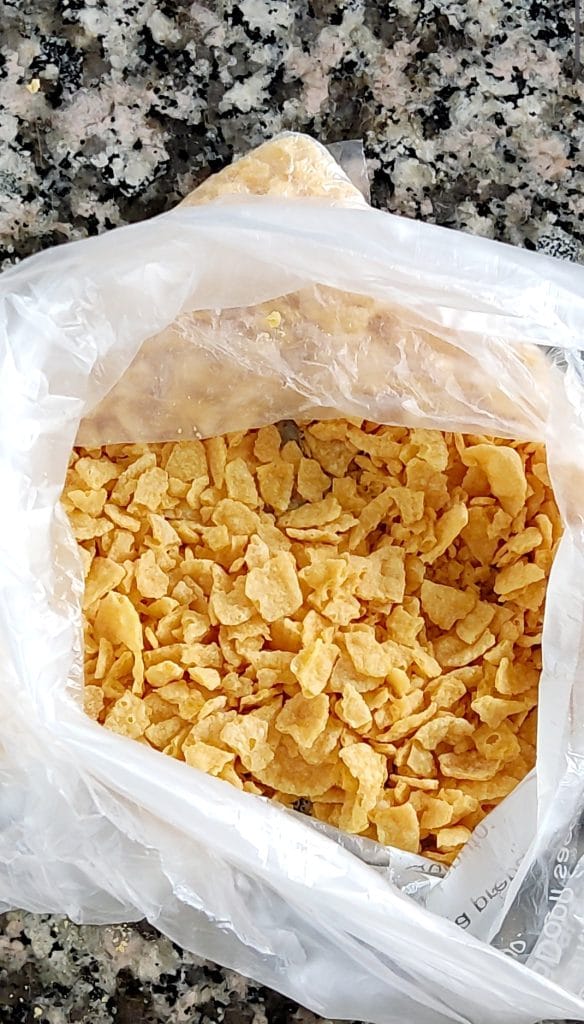 Coloque os cornflakes em um saco de alimentos e, simplesmente pressionando com as mãos, reduza-os a pedaços menores. Com a ajuda de uma pinça de cozinha, mergulhe os pedaços de frango primeiro na massa e depois em uma tigela pequena com os cornflakes.