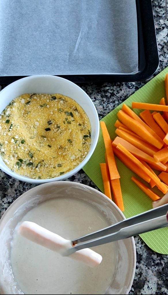 Misture em outra tigela a farinha de milho com o queijo parmesão ralado e o alecrim picado. Forre uma assadeira retangular com papel manteiga. Com a ajuda de uma pinça de cozinha, passe os Palitos de Abóbora primeiro na massa e depois na panagem com a farinha de milho.
