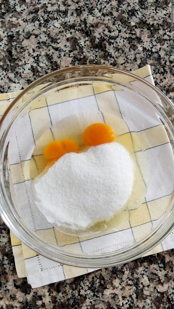Bata os 2 ovos inteiros com o açúcar usando uma batedeira elétrica por 7-8 minutos, até obter uma mistura clara e espumosa. Adicione a manteiga derretida, o café da moka e o café solúvel. Misture.