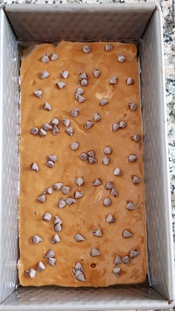 Despeje a massa em uma forma de Plumcake, a minha mede 20 x 11 cm, untada ou forrada com papel manteiga. Alise a superfície com a espátula e distribua por cima as outras gotas de chocolate.