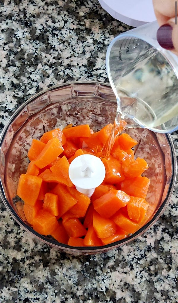 • Limpe a abóbora e corte-a em pedaços. Bata a abóbora em um liquidificador com a adição do óleo de sementes para obter um delicioso creme laranja.
