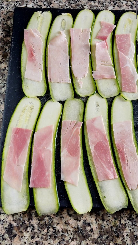 Coloque sobre cada fatia de abobrinha uma fatia de presunto cozido e uma fatia de queijo