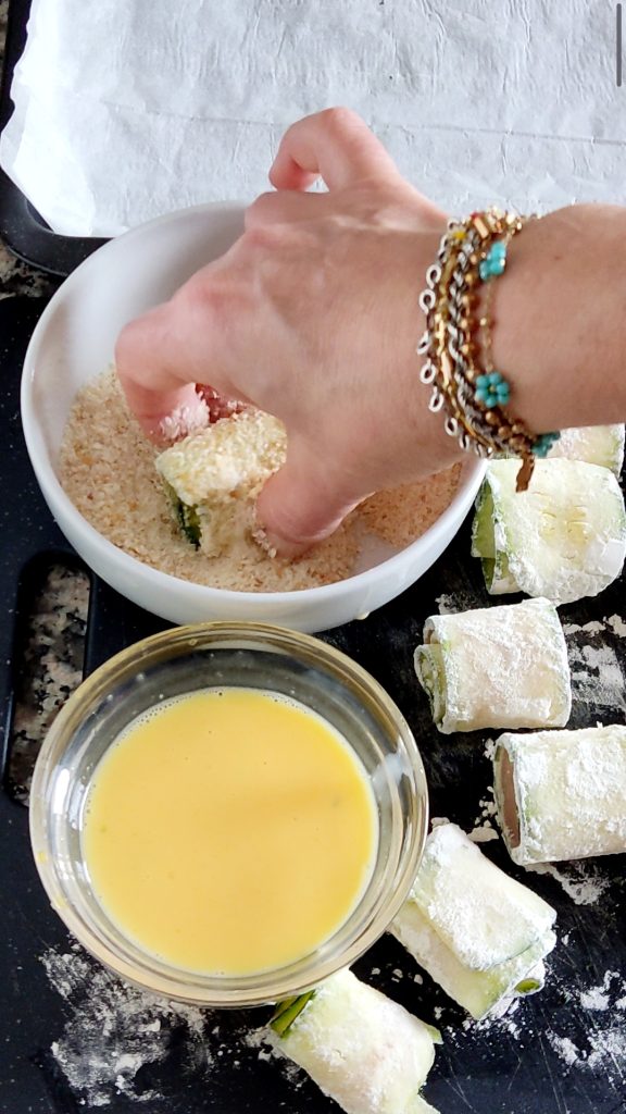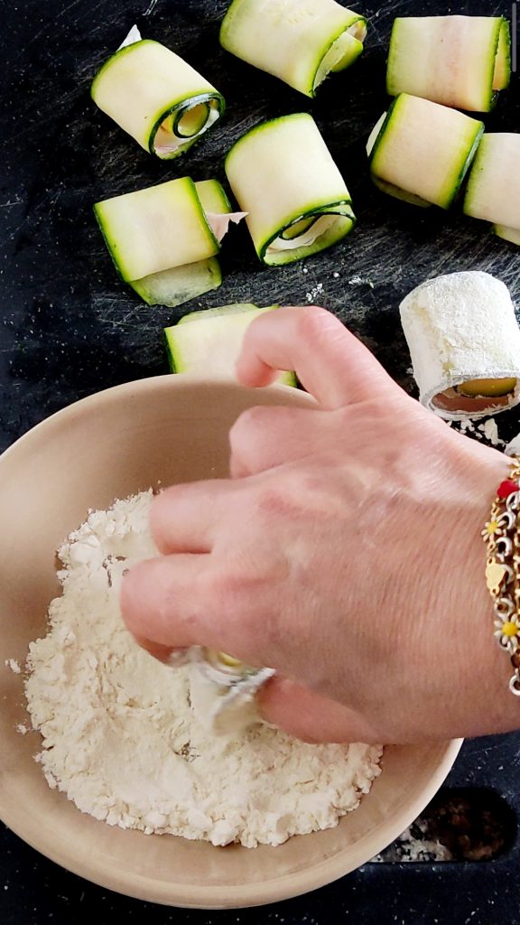 Passe os rolinhos de abobrinha na farinha fazendo aderir bem de todos os lados.