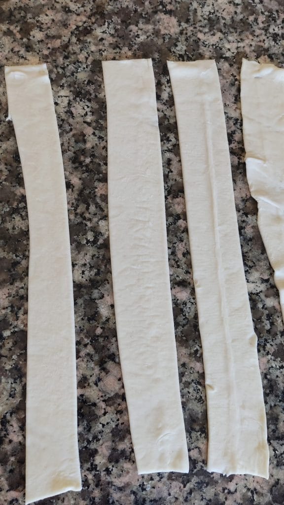 Prepare o Creme de confeiteiro seguindo a minha receita que você encontra AQUI. Lave os pêssegos e corte-os em fatias finas. Abra o rolo de massa folhada retangular sobre a bancada e corte-o em várias tiras.