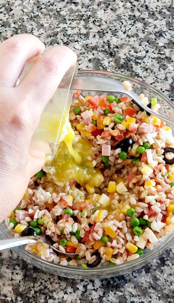 Adicione por último o tempero de azeite e limão e misture bem ajudando-se com 2 colheres. Cubra a tigela com filme plástico e deixe esfriar o Farro em salada por uma hora na geladeira.
