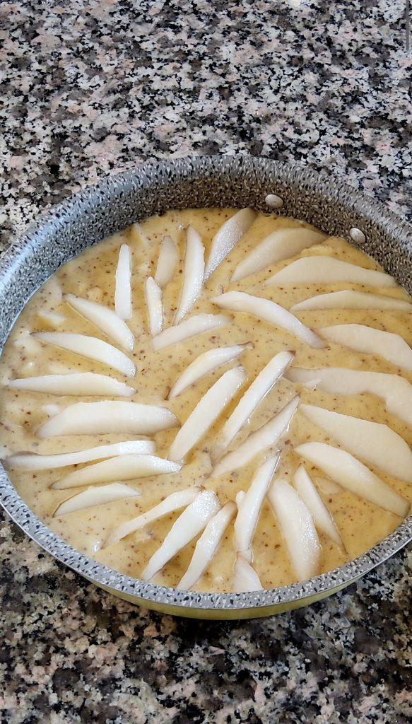 Arrume as fatias de peras na superfície, deixando-as afundar levemente na massa. Distribua por cima as amêndoas em lascas.