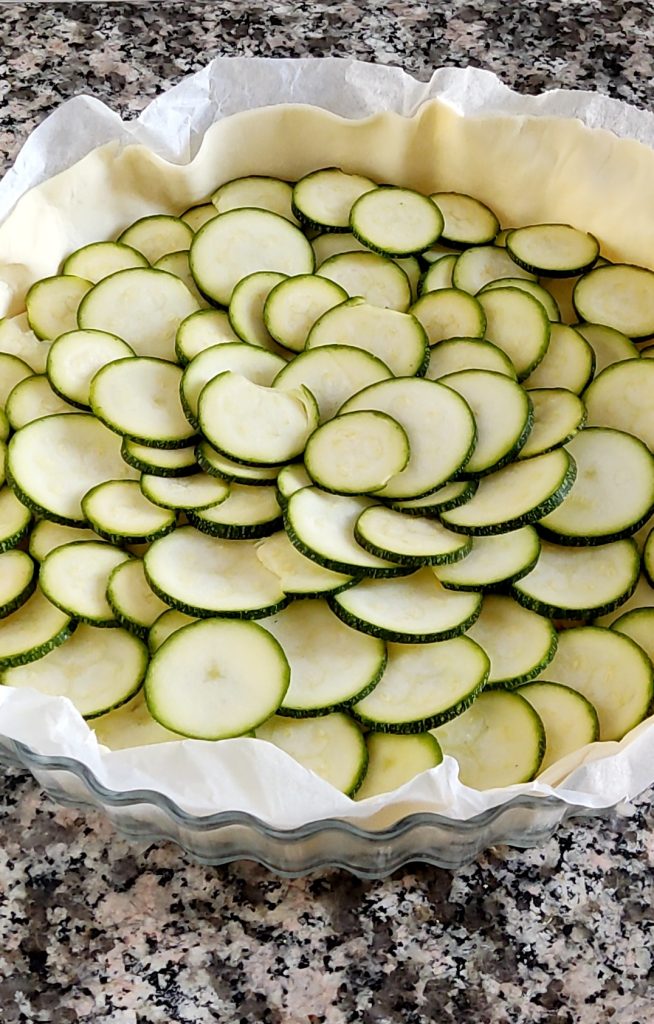 Coloque as fatias de provolone sobre o presunto, distribuindo-as mais ou menos uniformemente. Agora arrume as fatias de abobrinha em círculos concêntricos, começando da borda externa.