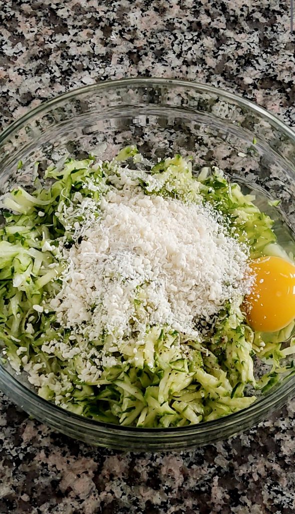 Coloque as abobrinhas raladas em uma tigela. Adicione uma pitada de sal e uma pitada de sal.