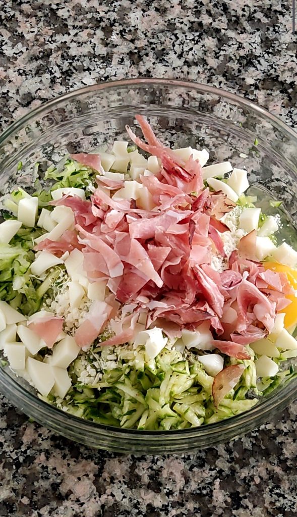 Adicione o queijo parmesão ralado, o speck e a scamorza em pequenos pedaços.