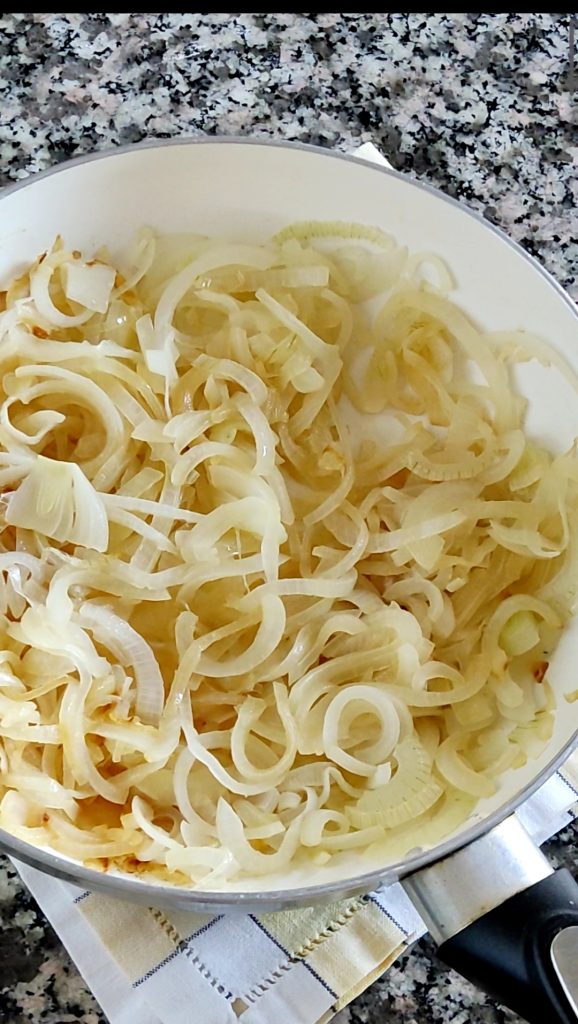 Despeje 2 colheres de sopa de azeite de oliva em uma frigideira. Adicione também as cebolas e deixe cozinhar em fogo baixo por 7-8 minutos. Mexa frequentemente com uma colher de pau para deixá-las bem macias.