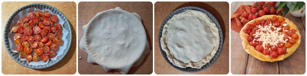 Pegue uma forma para tortas, forre com papel manteiga e disponha os tomatinhos com o corte para cima. Cubra com a massa brisée, dobre um pouco as bordas e está pronta para ir ao forno.