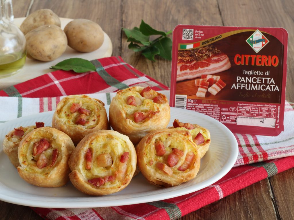 Um recheio saboroso de batatas, scamorza e Fatias de Bacon defumado Citterio, envolto por uma crocante massa folhada, para saborear quente com o recheio macio e derretido, mas são deliciosos também frios, assim como você pode prepará-los com antecedência e aquecê-los no forno ou na airfryer por alguns minutos.