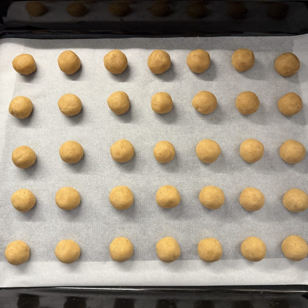 Após o tempo de descanso na geladeira, prepare uma assadeira com papel manteiga. Retire a massa da geladeira e deixe-a um pouco em temperatura ambiente. Para fazer as bolinhas todas iguais, você deve pesá-las. Eu as fiz de 10 g cada, mas se quiser menores (e assim obter mais biscoitos) pode fazer bolinhas de 5-7 gramas.