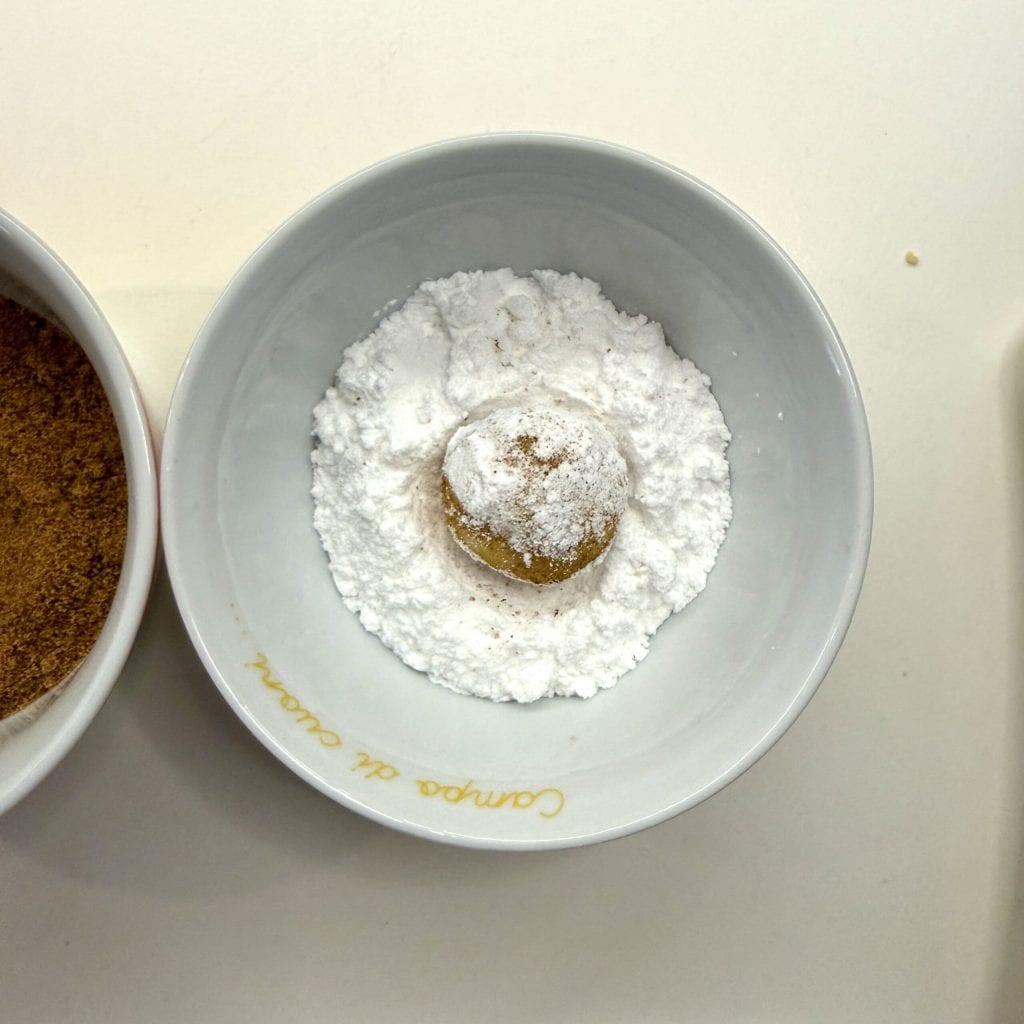 Faça bolinhas de cerca de 30 g de massa, passe primeiro no açúcar mascavo e depois no açúcar de confeiteiro, que você já colocou em 2 tigelinhas.