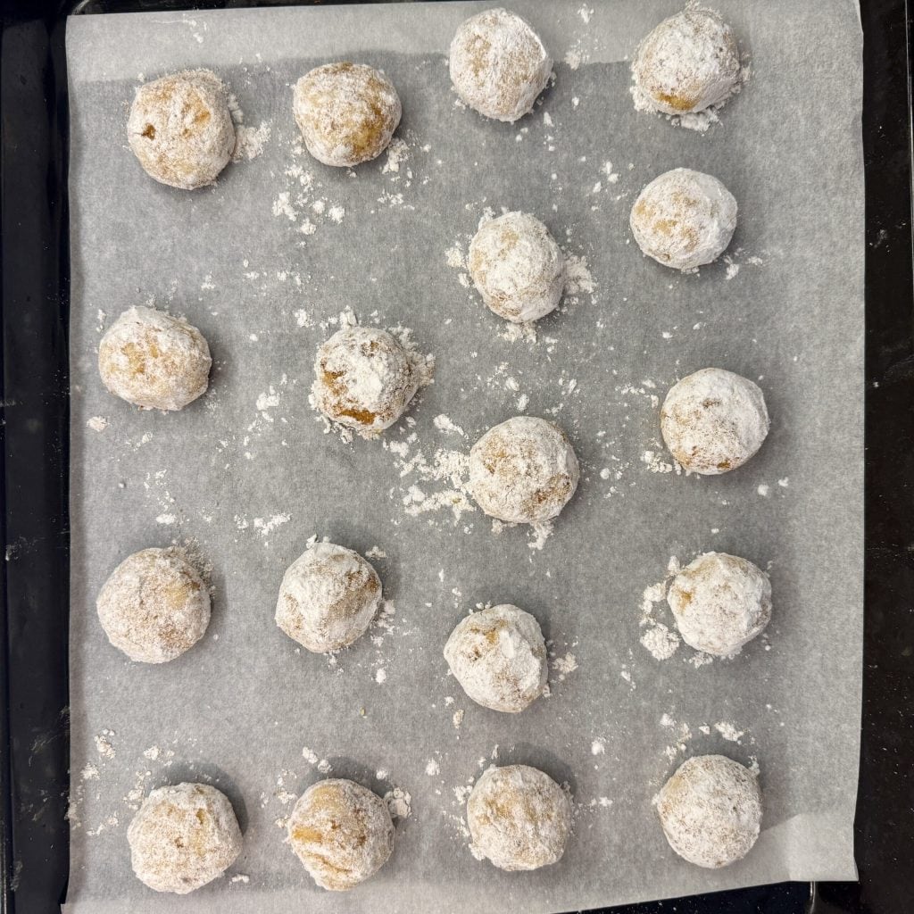 • Coloque as bolinhas em uma assadeira coberta com papel manteiga. Distancie ligeiramente os biscoitos de abóbora.