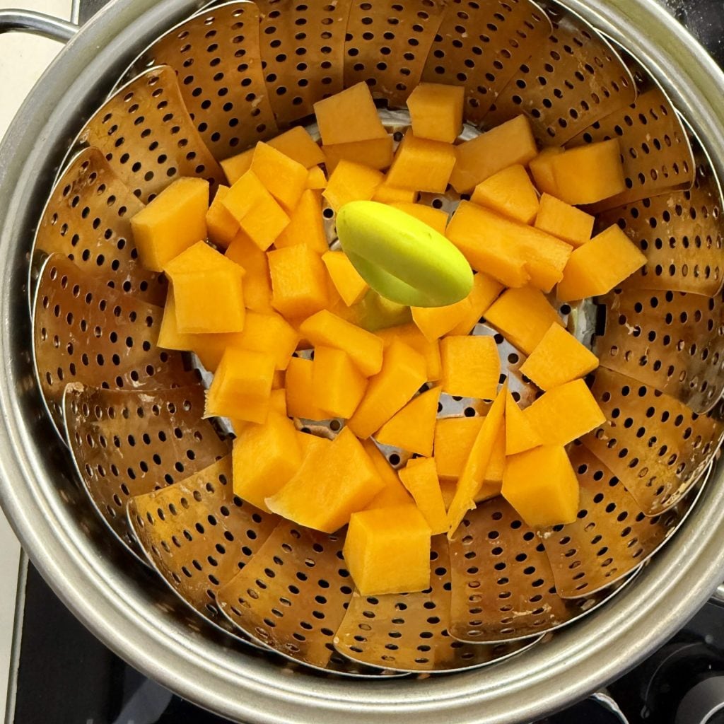 Descasque a abóbora, corte-a em pedaços e cozinhe-a no vapor. Eu usei uma panela com um pouco de água e um cesto para cozinhar a vapor. Cozinhe por cerca de 20-25 minutos, até que esteja macia.