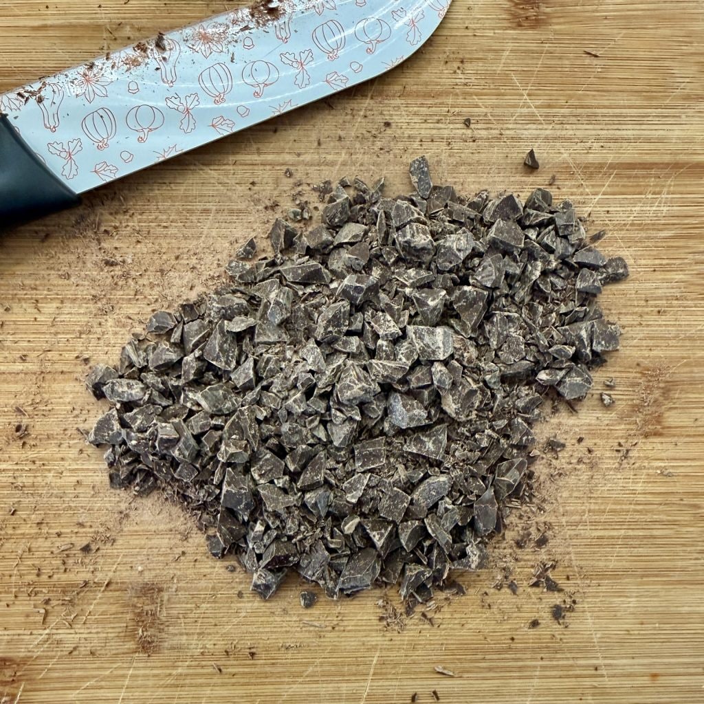 Enquanto isso, pique o chocolate amargo com uma faca. Não pique muito fino: desse modo, você encontrará os pedaços de chocolate no biscoito.
