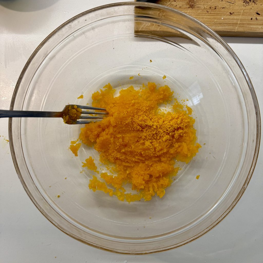 Uma vez cozida, transfira a abóbora para uma tigela. Adicione também a casca de laranja ralada ou meia ampola de aroma de laranja. Amasse com um garfo para reduzir a abóbora a purê. Reserve.