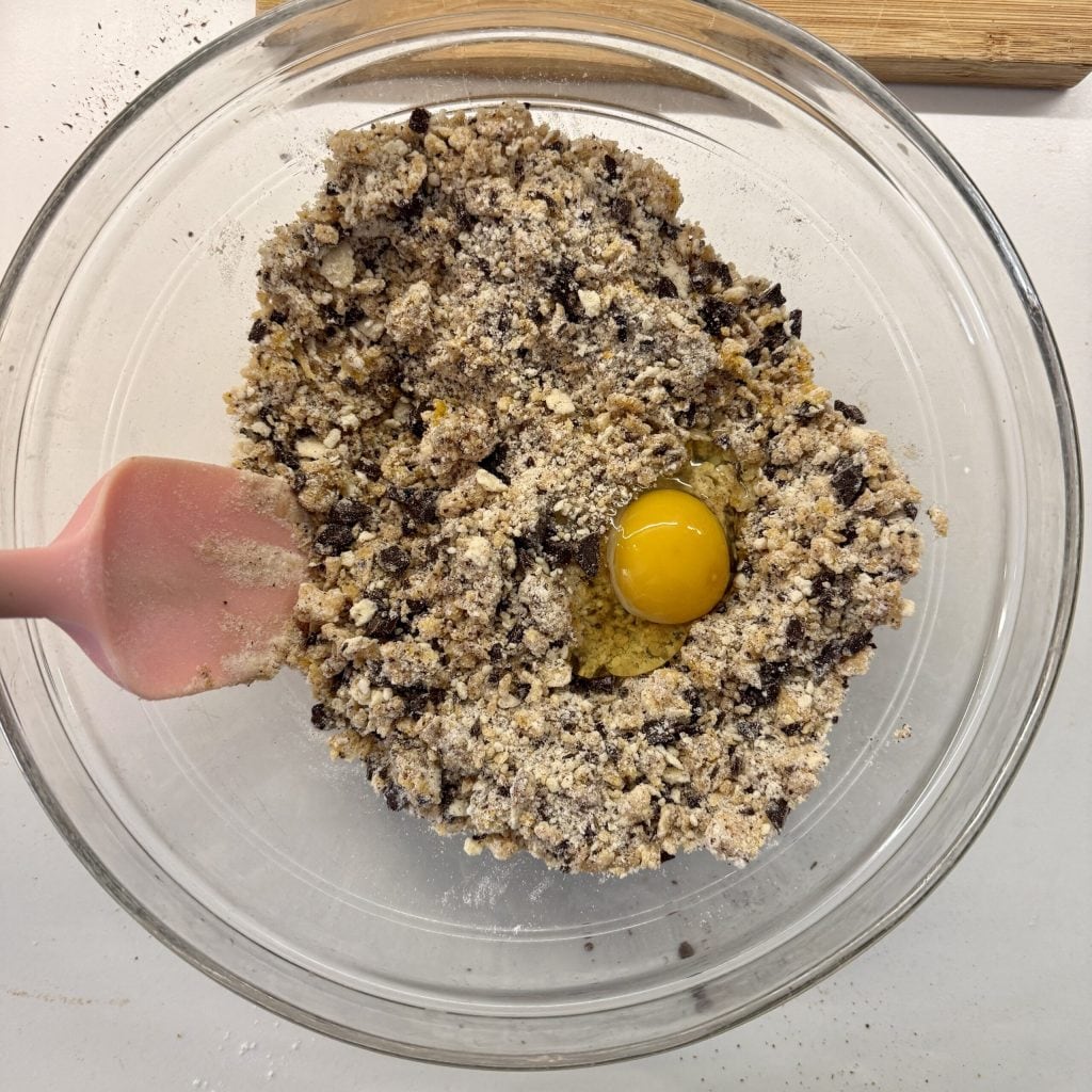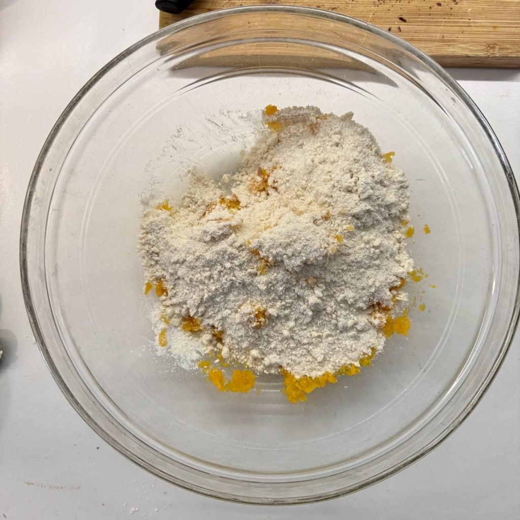 Neste ponto, despeje os ingredientes secos na primeira tigela contendo o purê de abóbora.