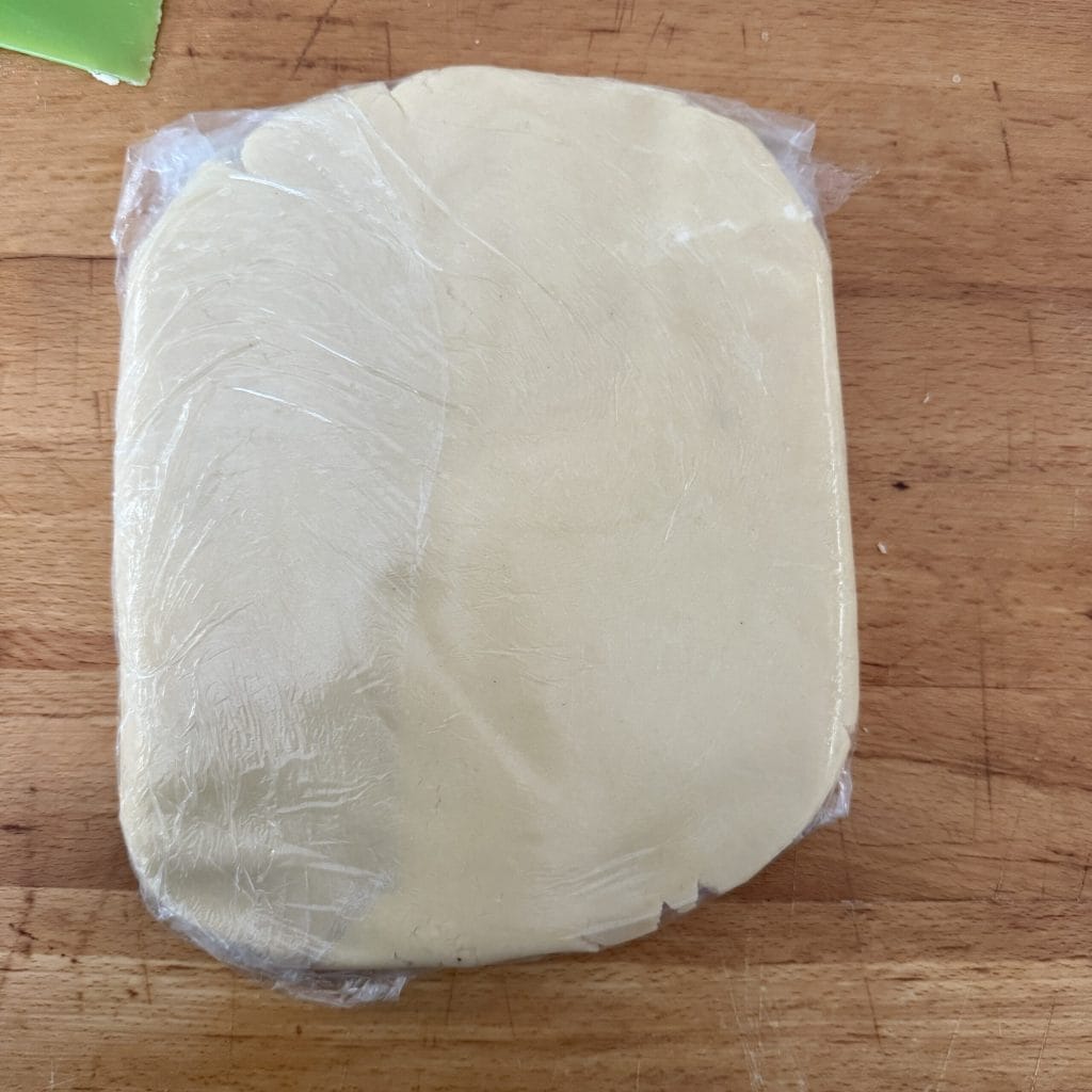 Pegue a massa, compacte-a com as mãos, achate levemente o bloco e envolva em filme plástico. Coloque a massa dos biscoitos na geladeira por pelo menos uma hora e depois siga conforme a receita.