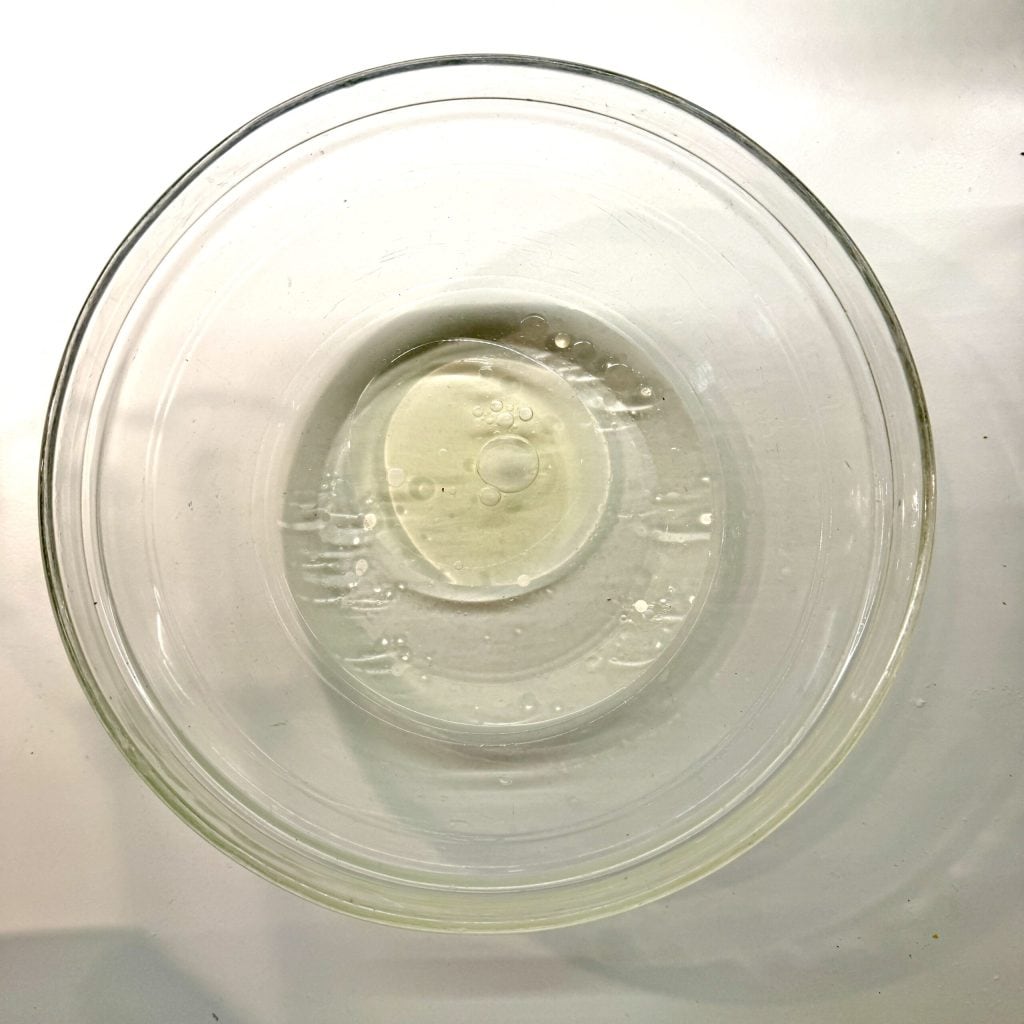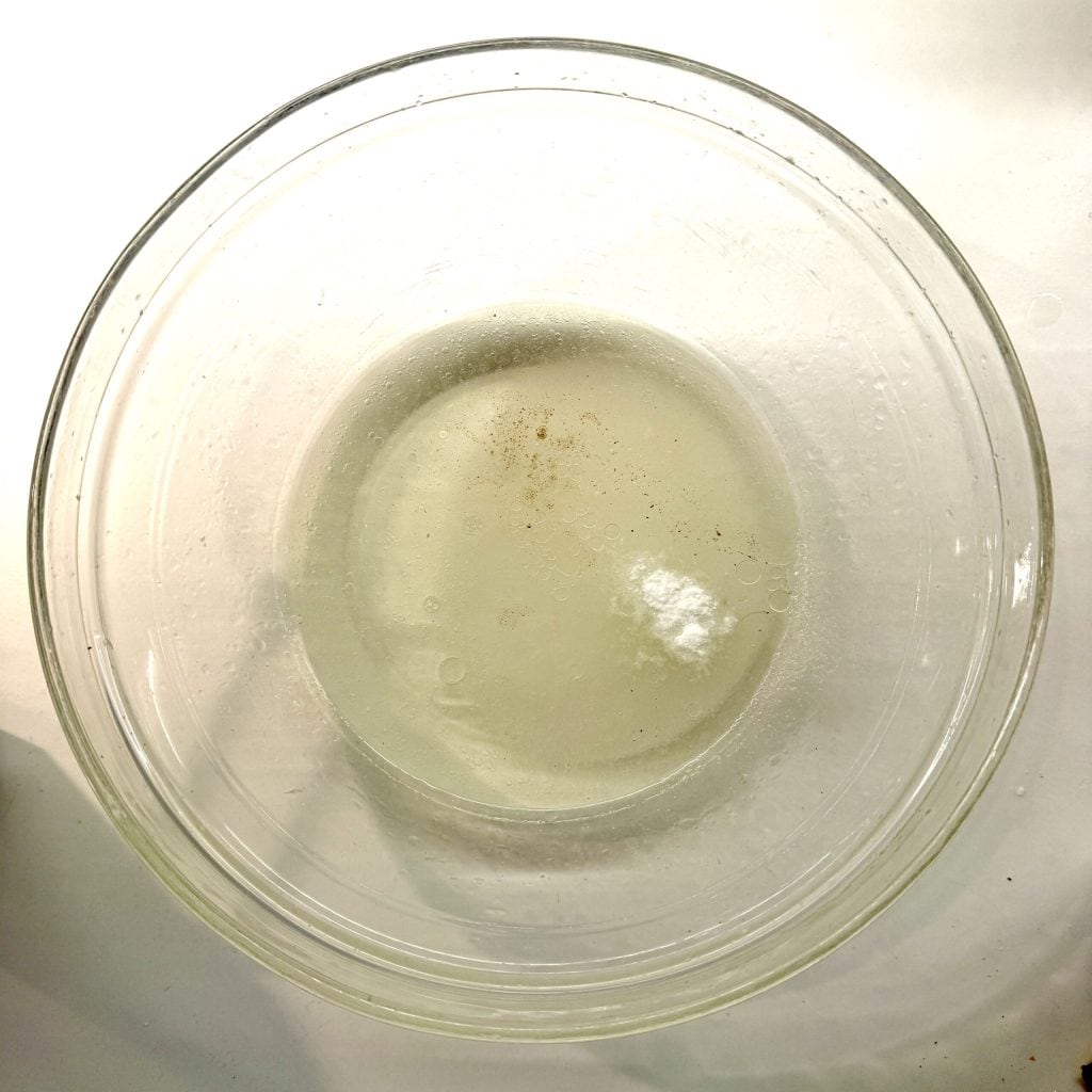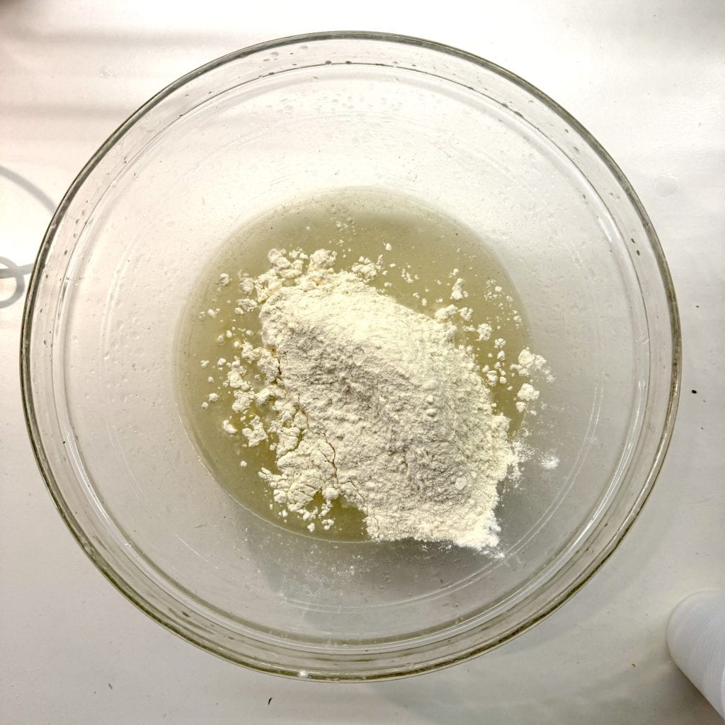 Na tigela, coloque a água à temperatura ambiente e o óleo.