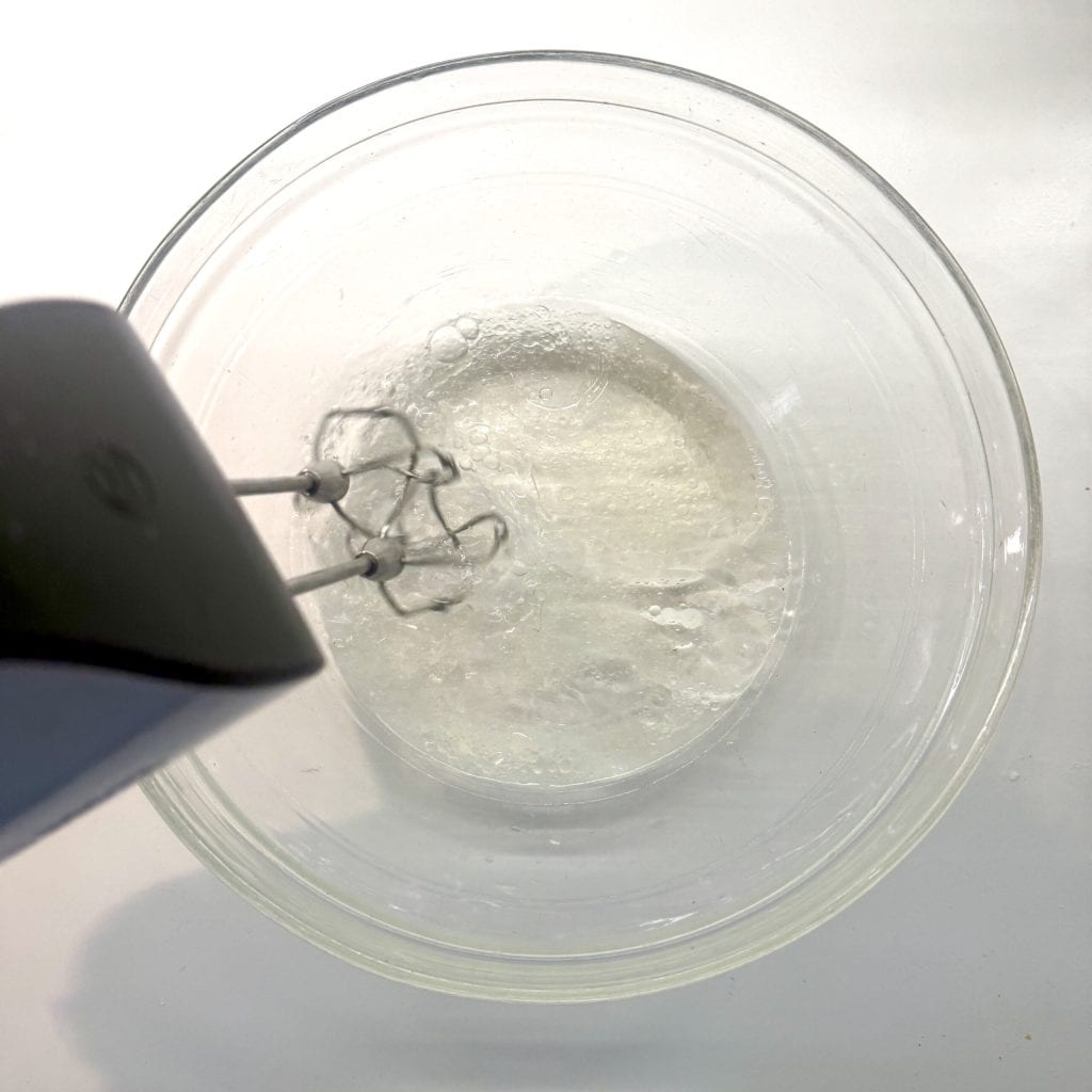 Adicione o açúcar e a vanilina (ou outro aroma) e misture com a batedeira até que o açúcar esteja quase dissolvido.