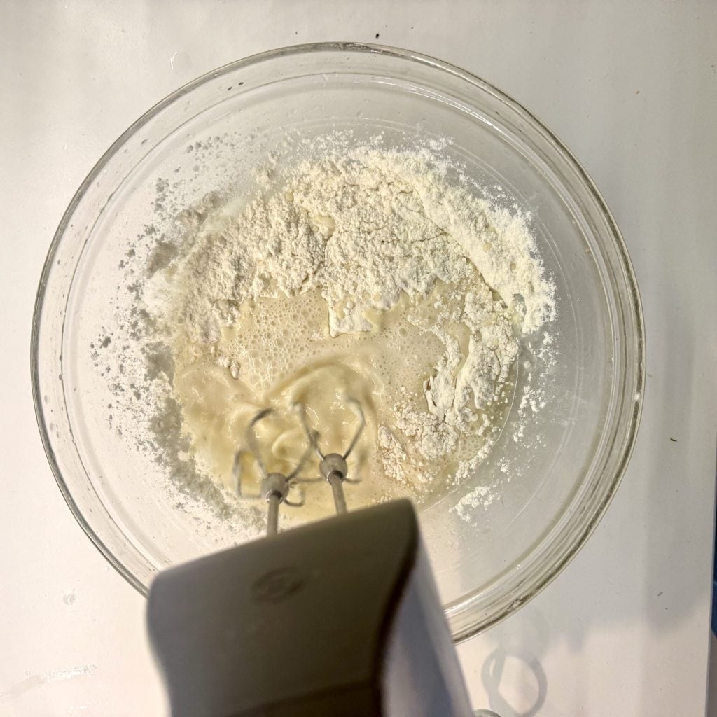 Adicione uma pitada de sal e o fermento peneirado e misture novamente.